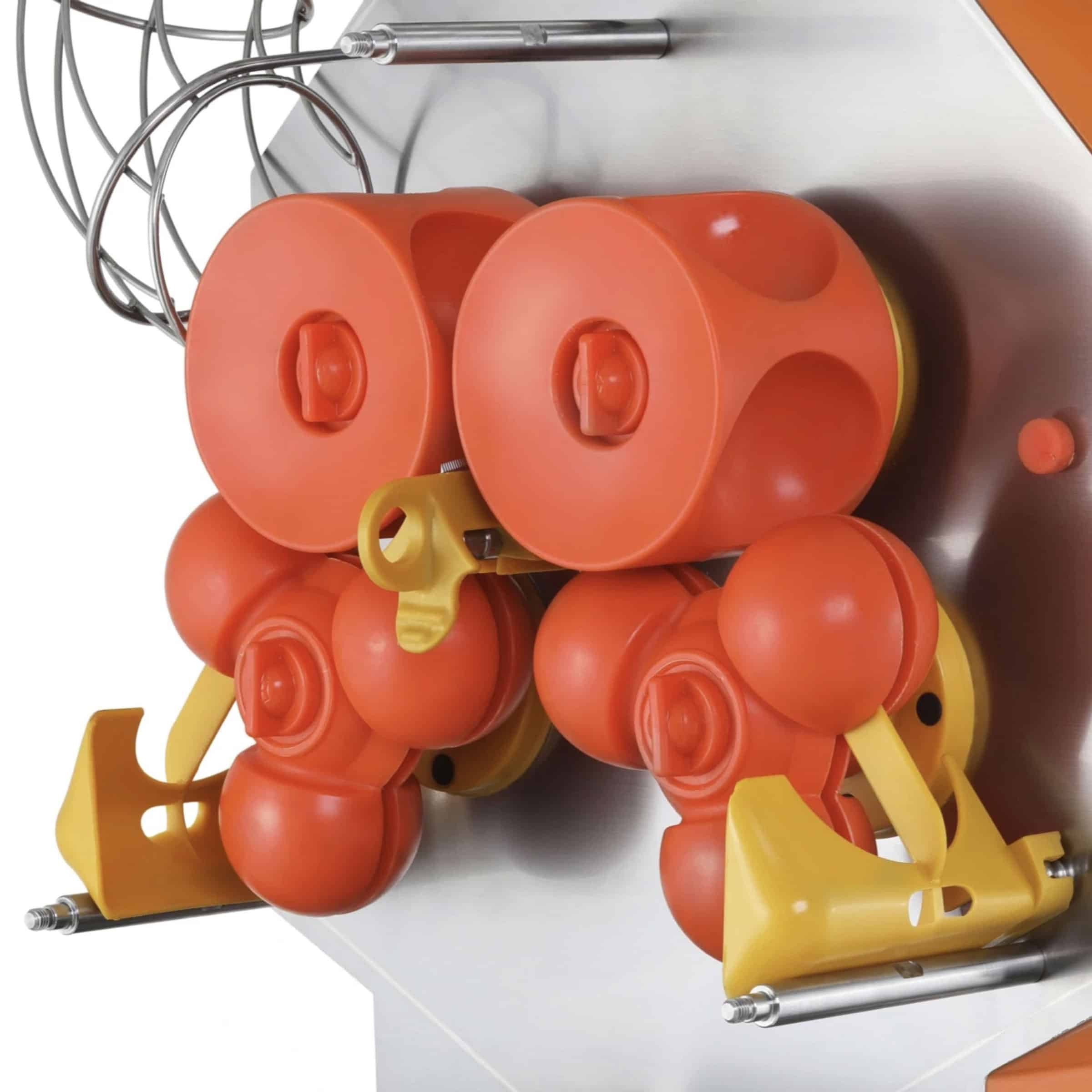 De voorkap is gemaakt van duurzaam polycarbonaat en voorkomt het spatten van het sap. Dankzij de veiligheidsschakelaar op de kap zal de machine niet werken als de kap niet op zijn plaats zit. Dit zorgt voor een veilig persproces zonder enig arbeidsongeval te veroorzaken.