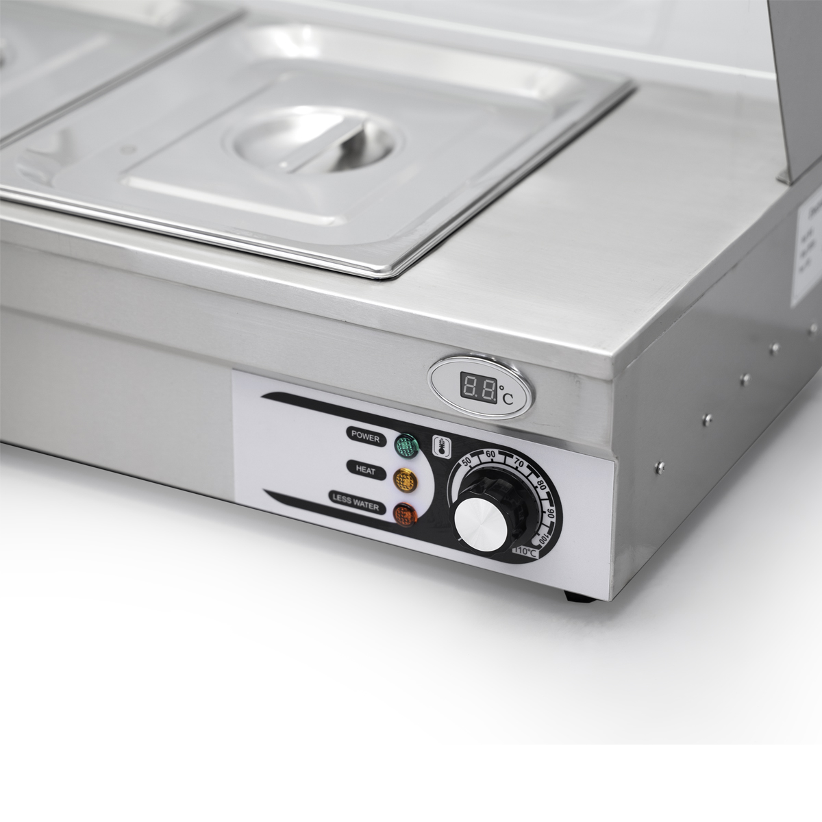 Het apparaat is gemaakt van hoogwaardig roestvrij staal en heeft een grote capaciteit van 6x 1/2 gastronorm. Dit biedt voldoende ruimte om een verscheidenheid aan producten warm te houden. Bovendien zorgt de bij inbegrepen deksel van de Bain Marie ervoor dat voedsel niet uitdroogt of verbrandt, waardoor uw gerechten vers en smaakvol blijven.