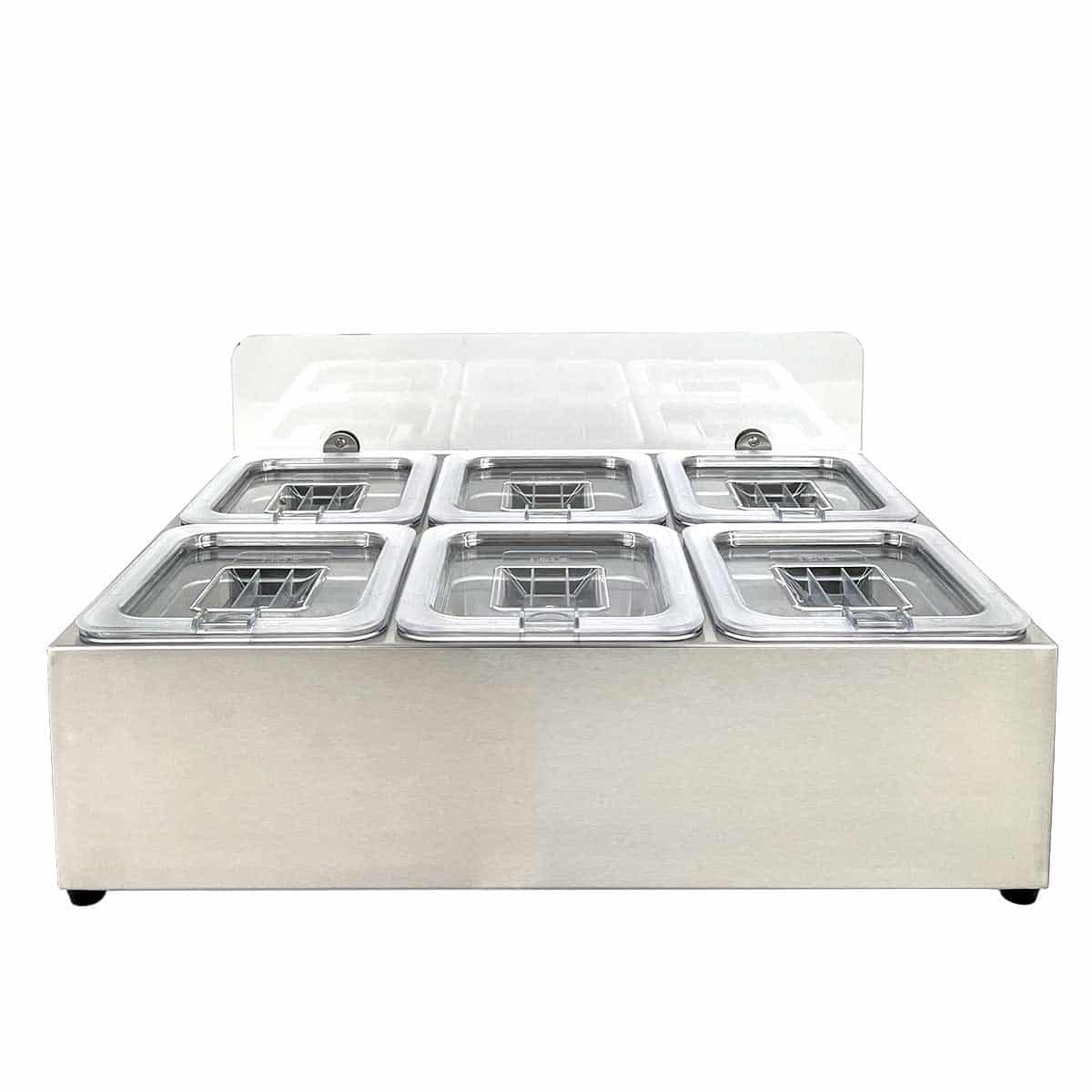 De bakhouder is gemaakt van duurzaam roestvrij staal en biedt voldoende ruimte om zes 1/6 gastronorm bakken te plaatsen, zodat u uw producten op een georganiseerde manier kunt opslaan.
