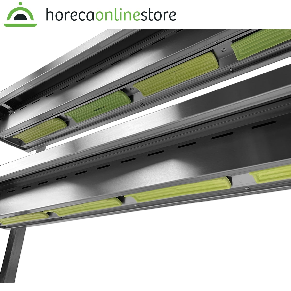 Om veilig, optimaal en efficiënt te kunnen werken in uw professionele keuken is een RVS warmtebrug van groot belang. Voorzien van een extra sterk gelast blad, stevige poten en strak afgewerkte hoeken is deze warmtebrug van het merk HCB daarom de perfecte keuze! De warmtebrug is uiterst geschikt voor het warm houden van uw borden en gerechten. Verder word de warmte goed verdeeld omdat deze warmtebrug voorzien is van 2×3 keramische lampen van elk 250 watt.