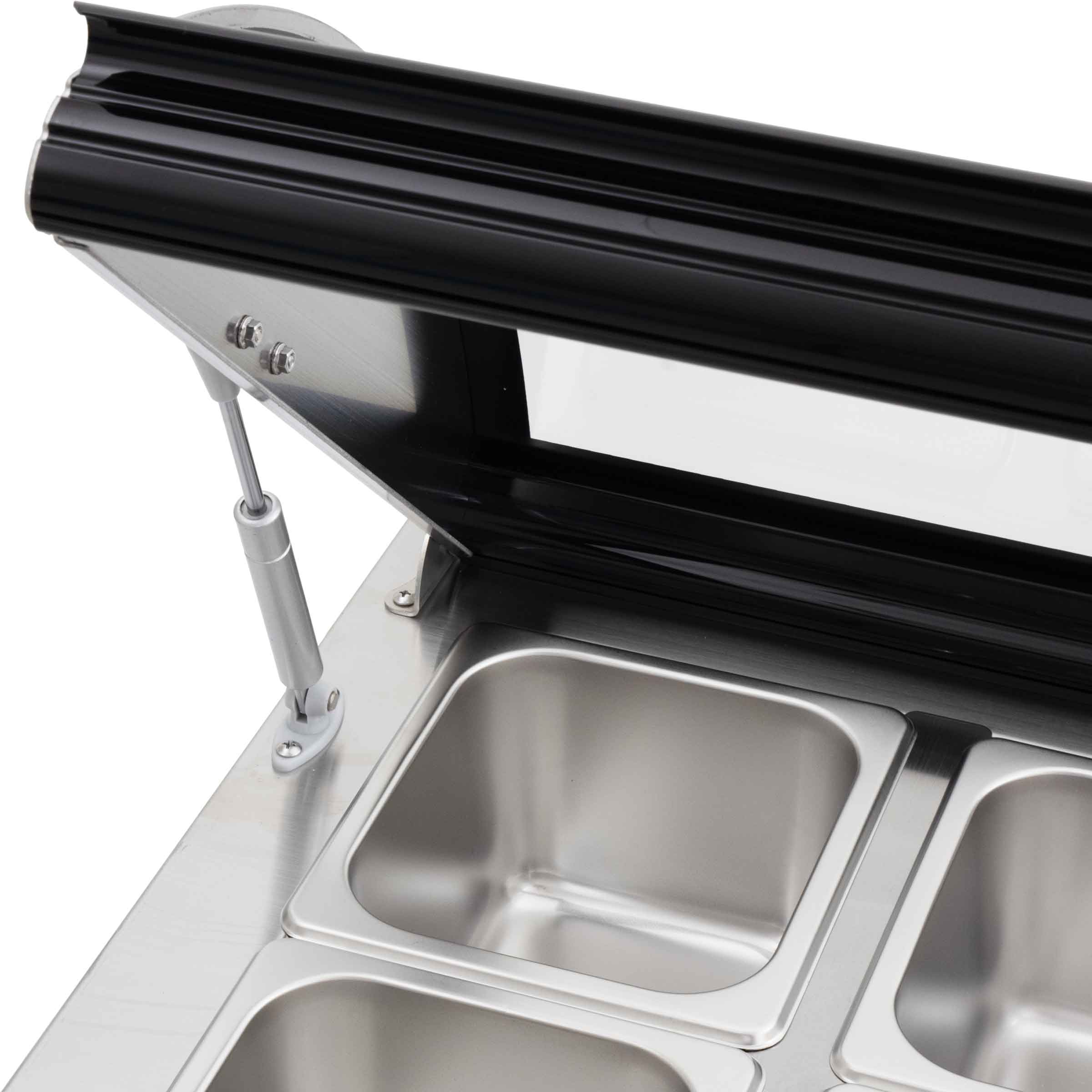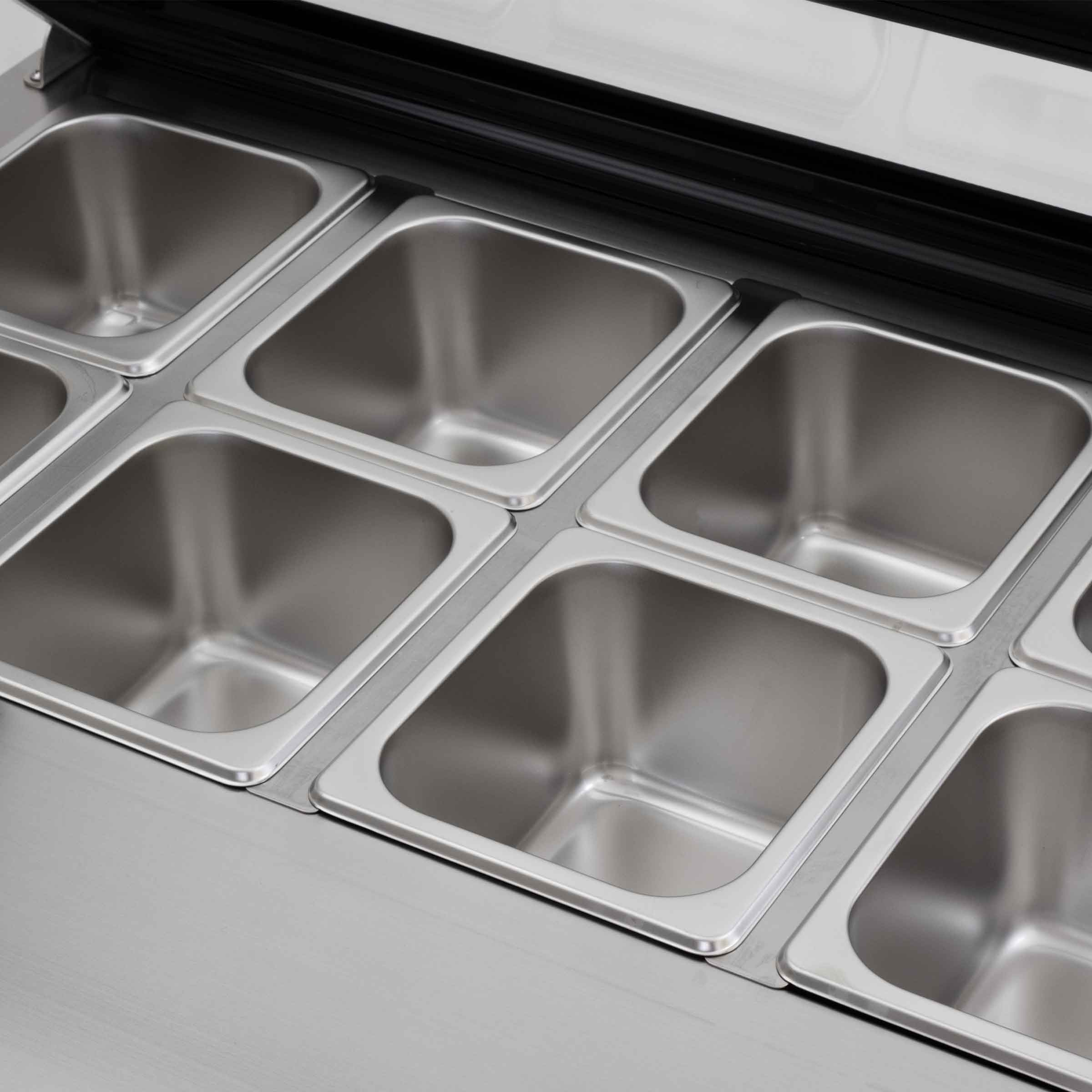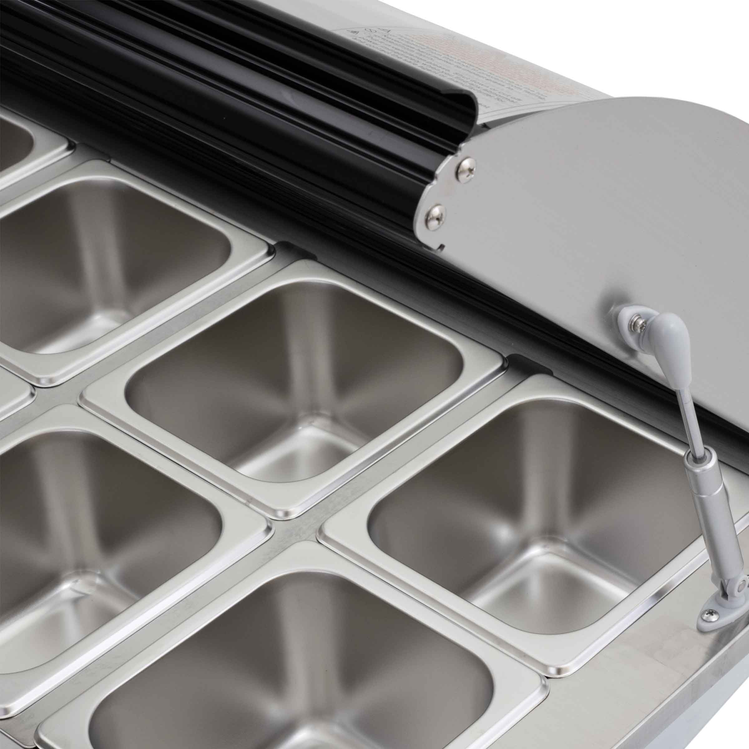 Veelzijdige Presentatie: Met ruimte voor maar liefst 8 bakken van 1/6 maat gastronorm, biedt onze opzet koelvitrine voldoende ruimte om uw gerechten te presenteren en te beschermen. Orden uw gerechten op een overzichtelijke manier en laat uw klanten genieten van een visuele smaakbeleving.