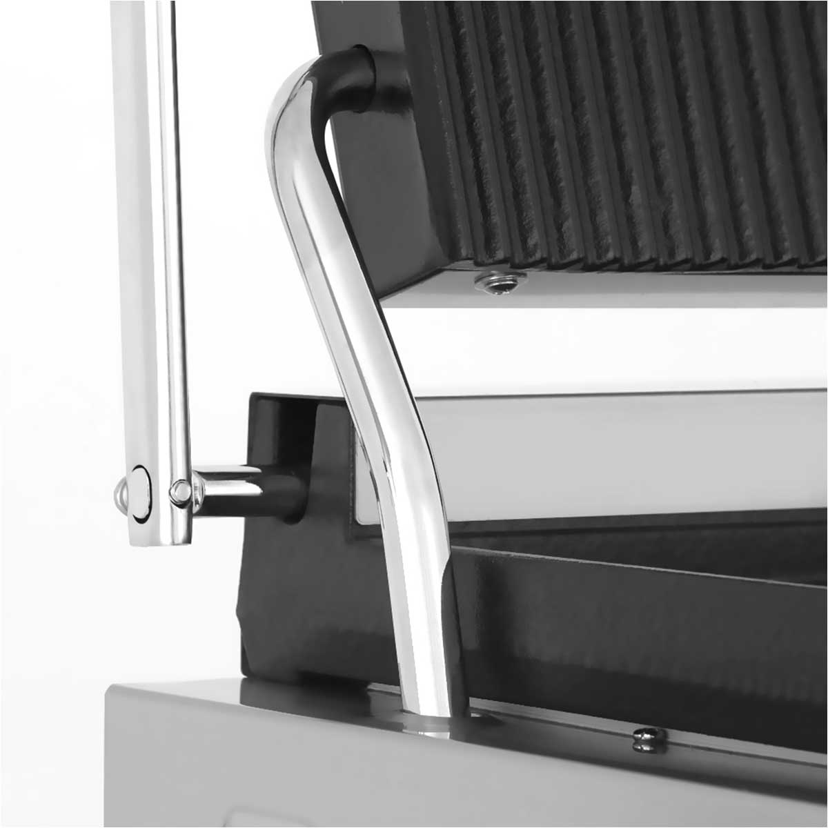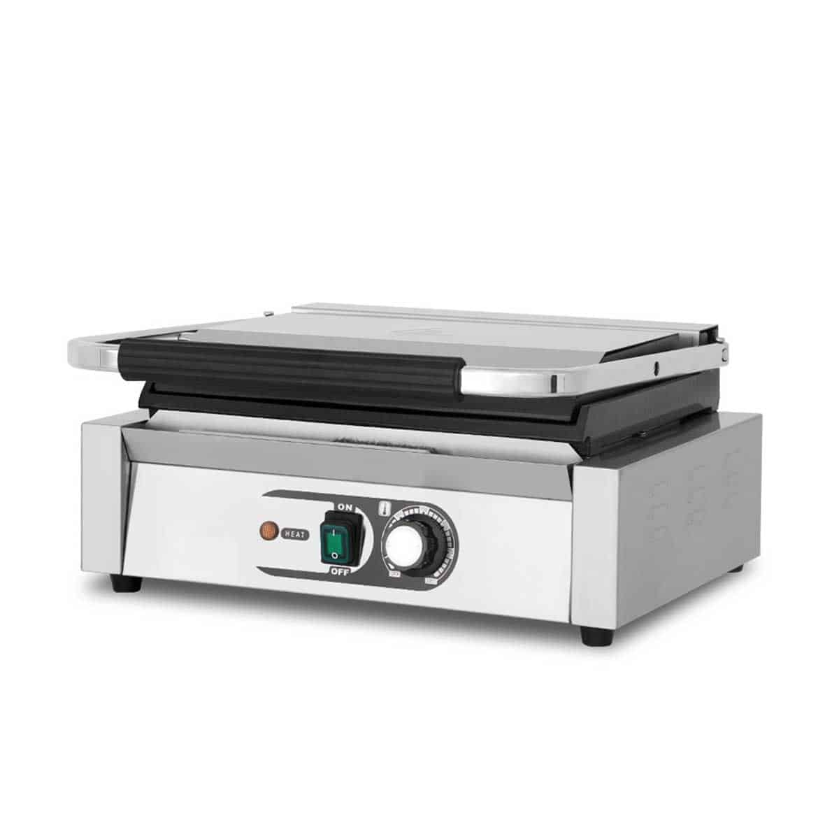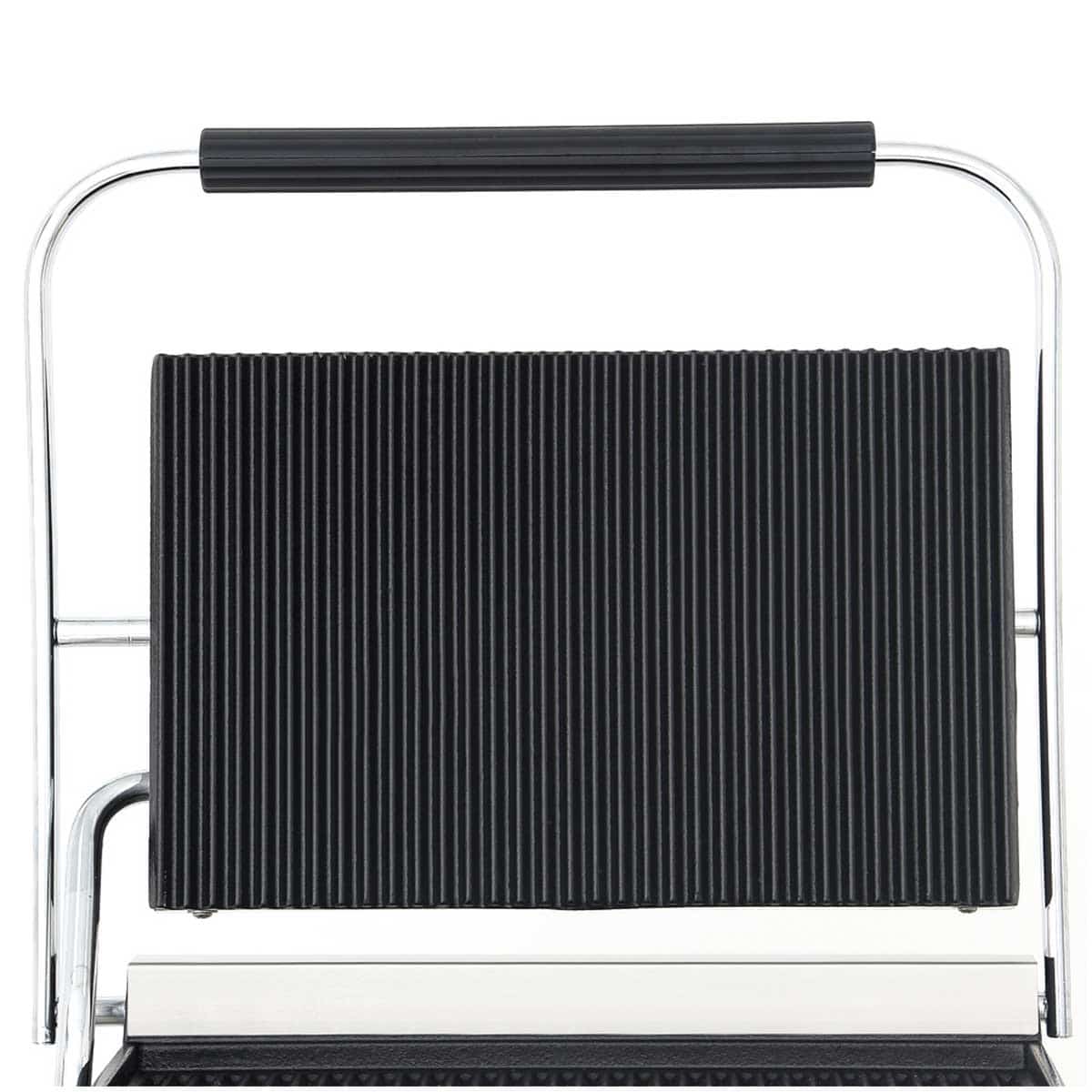 Het geribbelde oppervlak zorgt voor die kenmerkende grillstrepen op uw producten, terwijl de antiaanbaklaag ervoor zorgt dat uw gerechten niet blijven plakken en gemakkelijk te reinigen zijn. De paninigrill heeft ook een handige vetopvangbak die het overtollige vet opvangt en het schoonmaken nog eenvoudiger maakt.