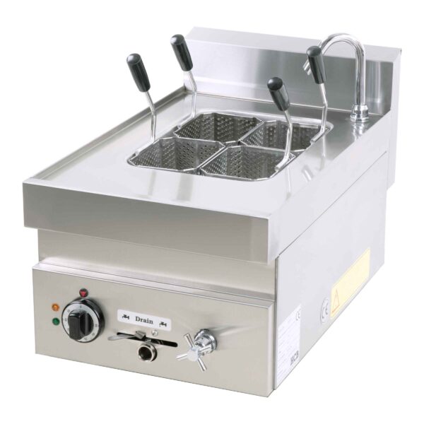 Daarnaast beschikt het apparaat over een bedienbare vulkraan voor gemakkelijk vullen en een aftapkraan met veiligheidsvergrendeling om onbedoeld leeglopen te voorkomen. De pastakoker is tevens voorzien van veiligheidsthermostaten en een lekbak met opstaande rand rondom de kuip voor extra gebruiksgemak, veiligheid en eenvoudige reiniging.