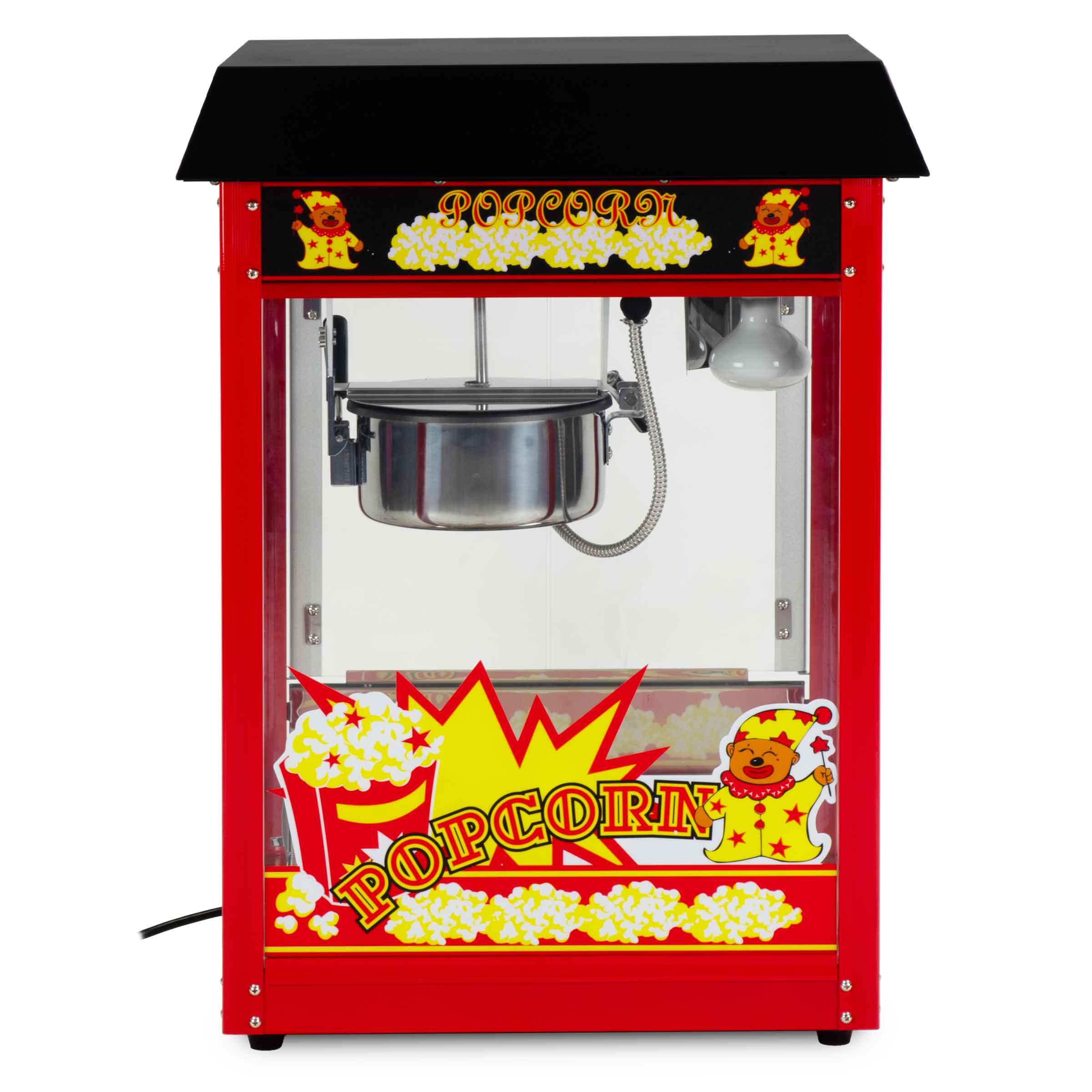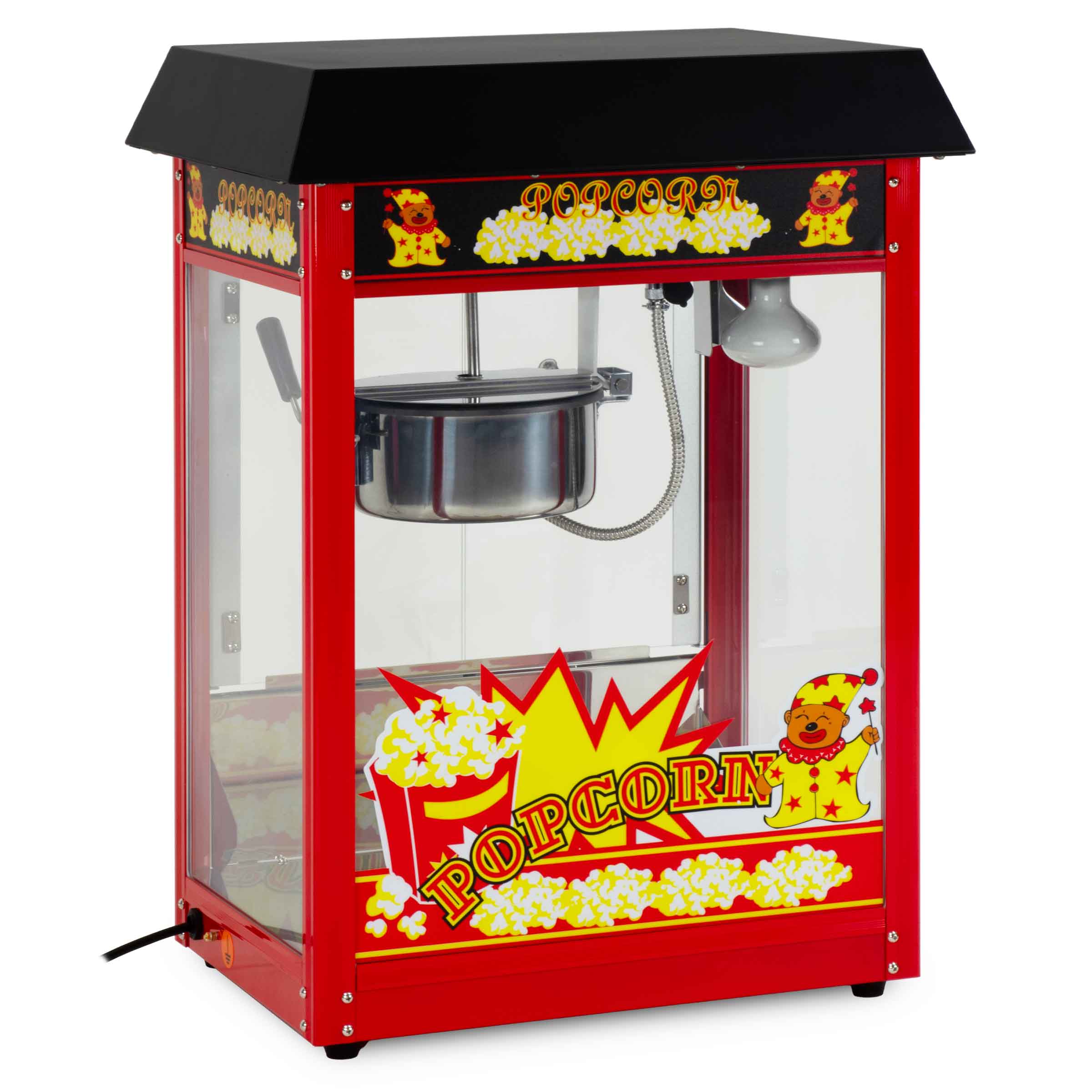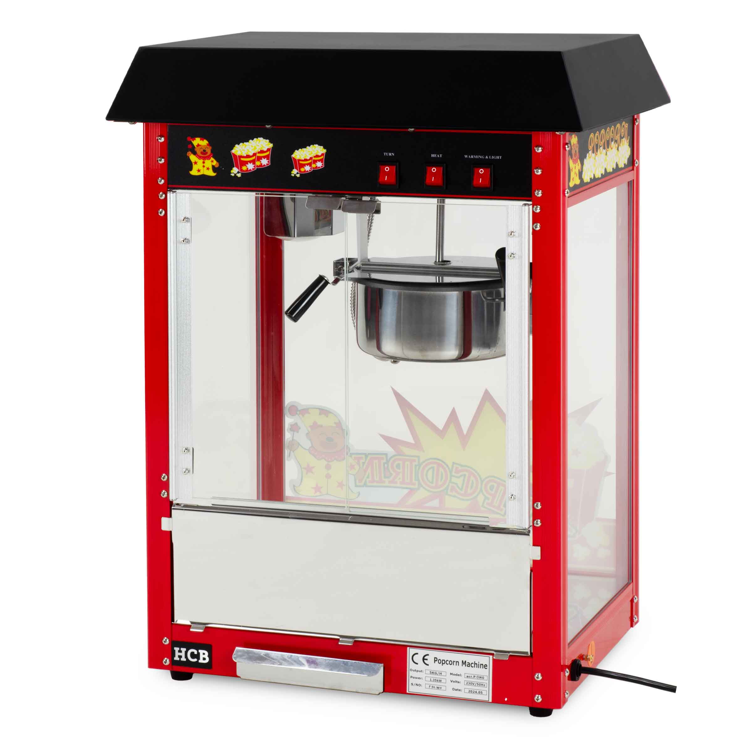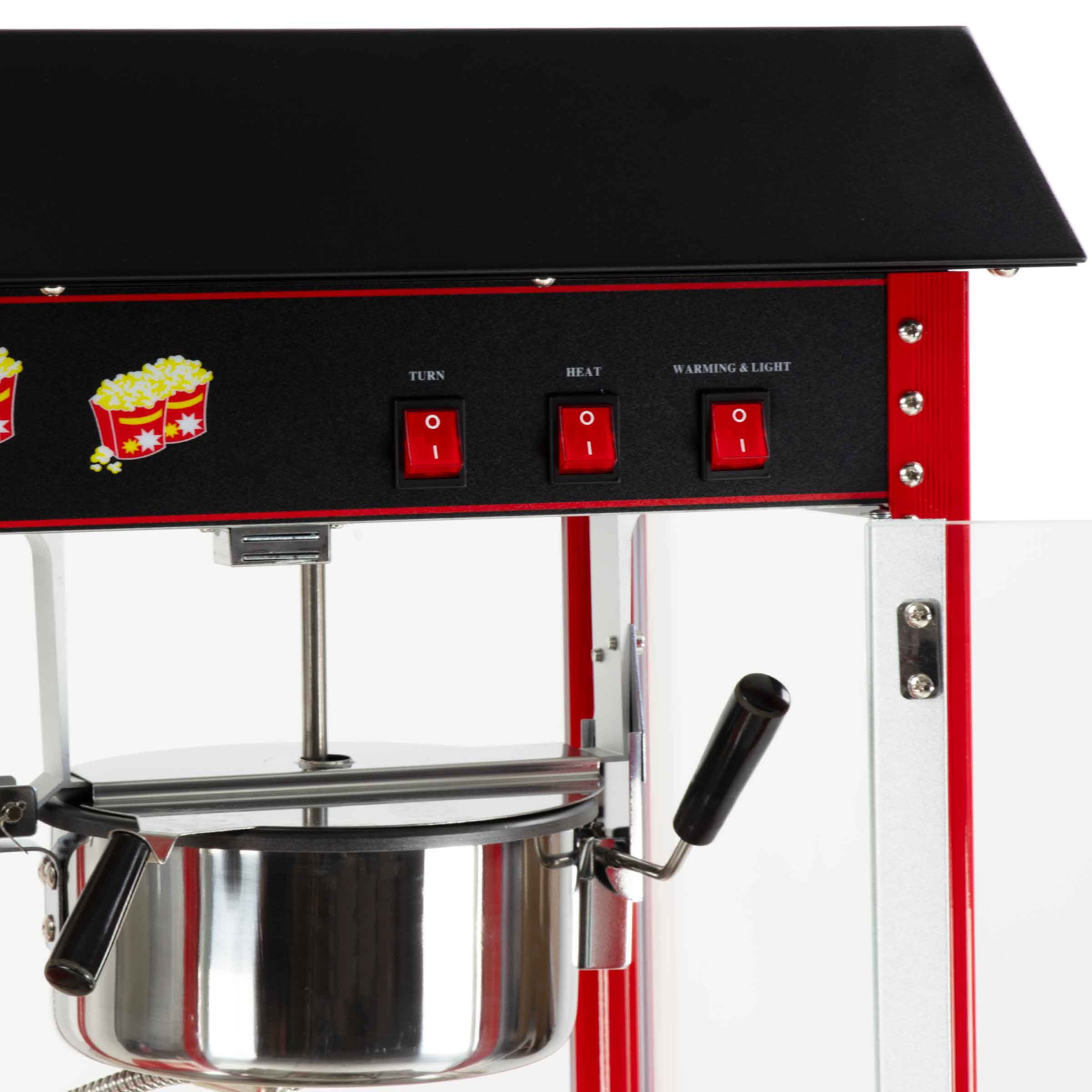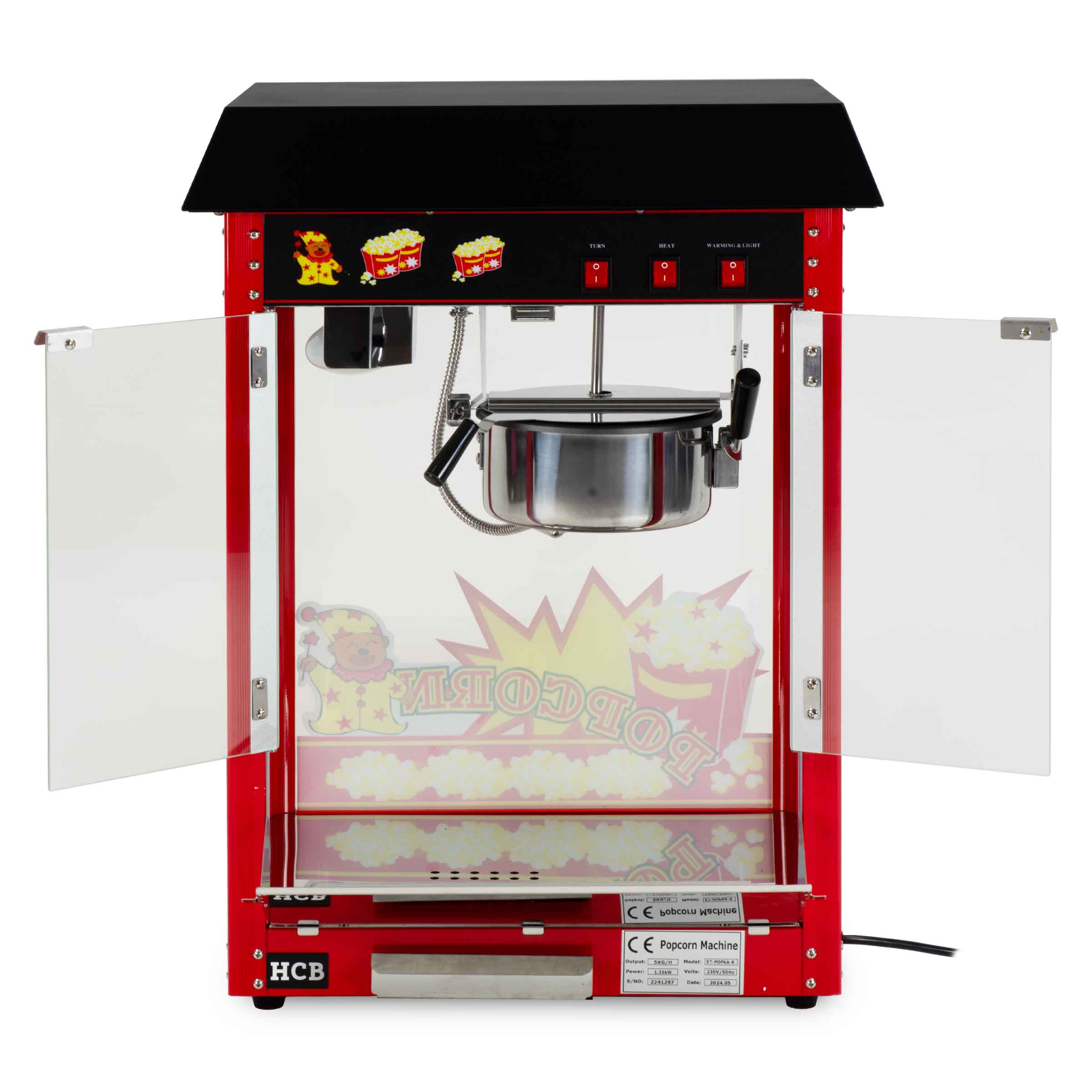 Professionele popcornmachine, energiezuinig en veilig in gebruik. Frame van aluminiumlegering, robuuste behuizing van gehard glas en rood gepoedercoat staal. De popcorn pan is voorzien van een roereenheid en is eenvoudig te legen dankzij het gebruik van een klem. De servicekant heeft een handige klep voor het scheppen van popcorn en daarnaast een grote draaideur van acrylglas. De kamer is verlicht om de vers gepopte popcorn mooi te presenteren. Met de handige kruimellade onder de kast verwijder je makkelijk niet-gepofte pitten en kruimels. Het duurt ca. 2 minuten om een partij popcorn te maken.