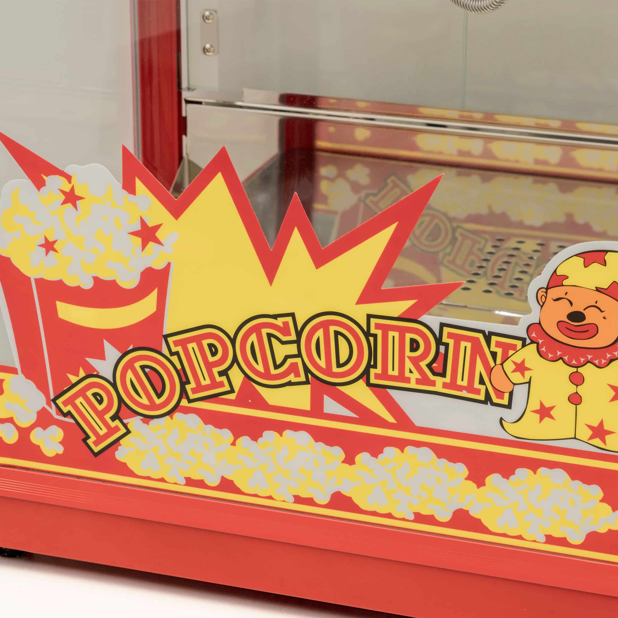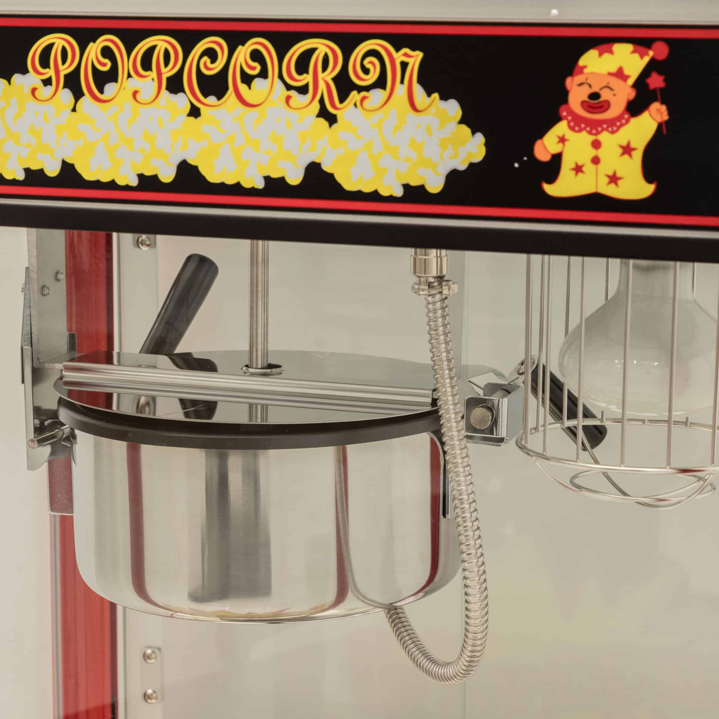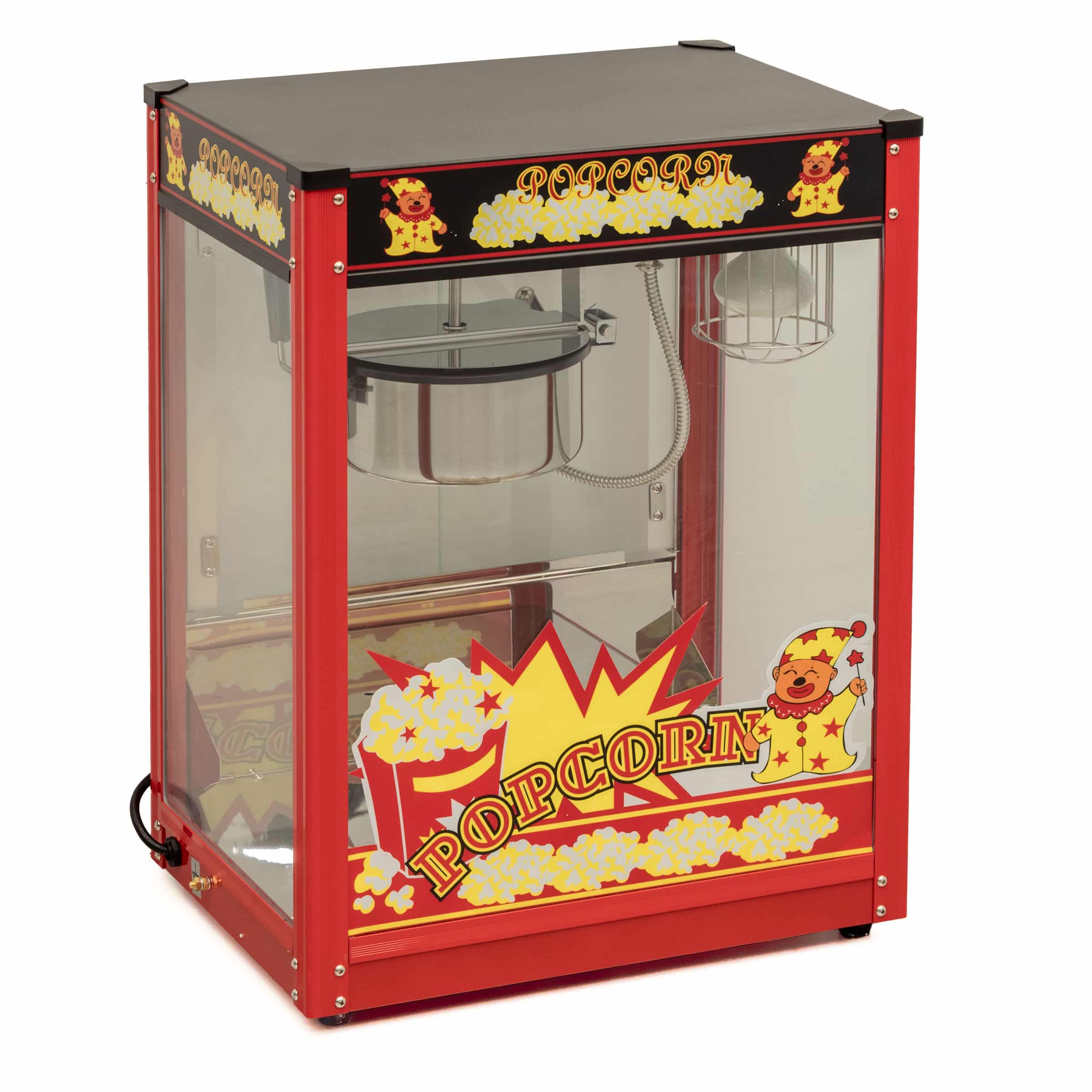 Professionele popcornmachine, energiezuinig en veilig in gebruik. Frame van aluminiumlegering, robuuste behuizing van gehard glas en rood gepoedercoat staal. De popcorn pan is voorzien van een roereenheid en is eenvoudig te legen dankzij het gebruik van een klem. De servicekant heeft een handige klep voor het scheppen van popcorn en daarnaast een grote draaideur van acrylglas. De kamer is verlicht om de vers gepopte popcorn mooi te presenteren. Met de handige kruimellade onder de kast verwijder je makkelijk niet-gepofte pitten en kruimels. Het duurt ca. 2 minuten om een partij popcorn te maken.