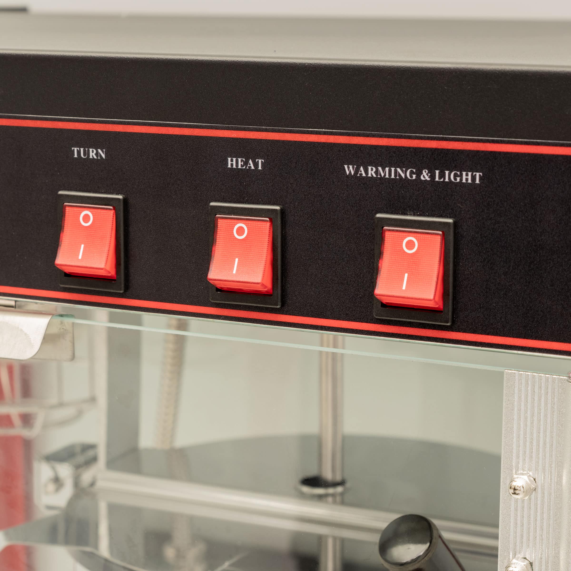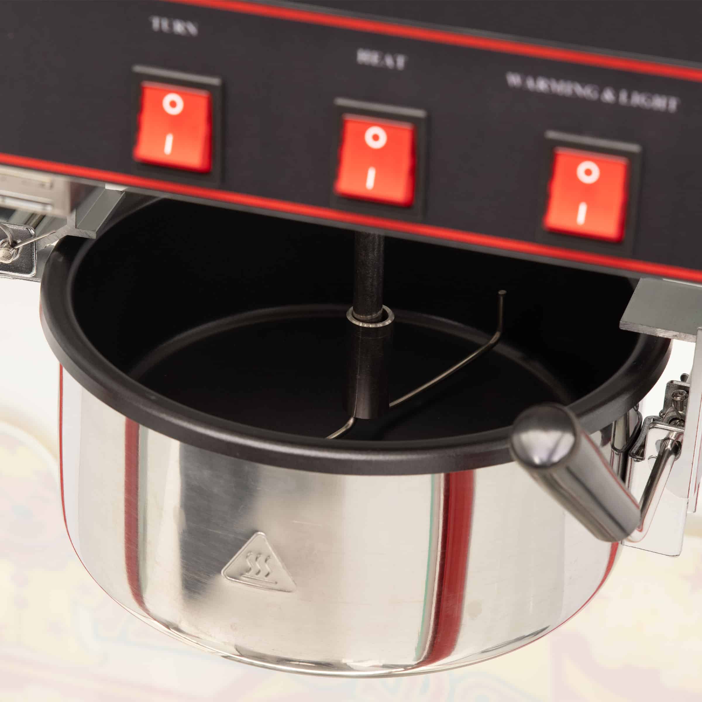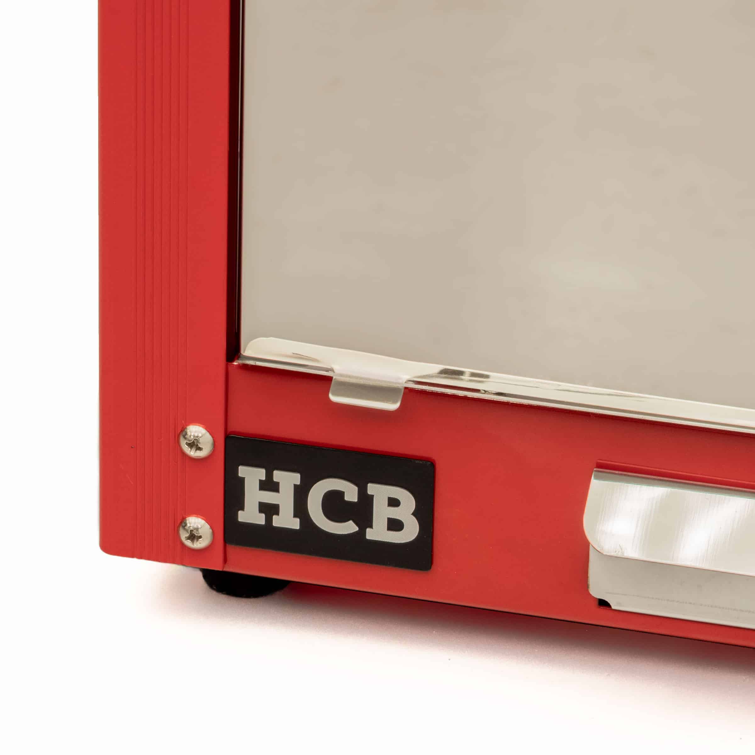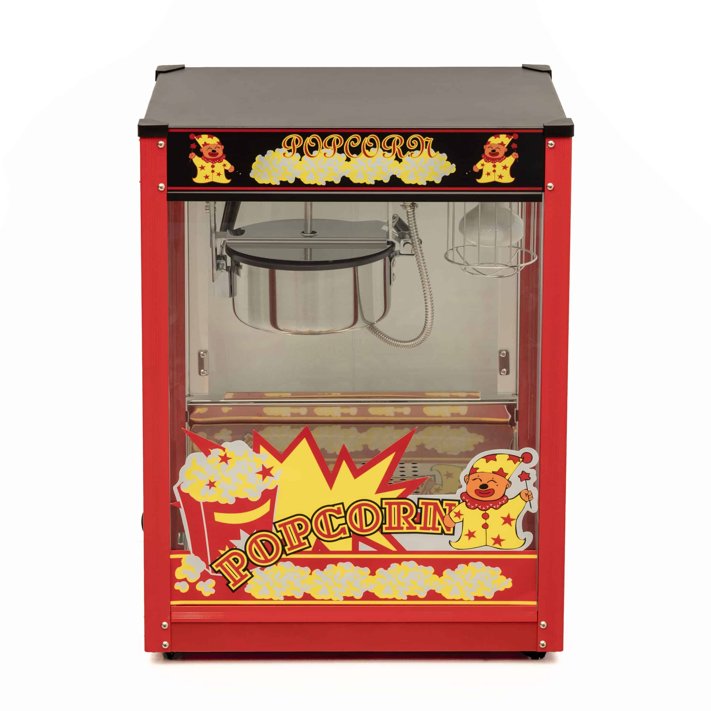 Professionele popcornmachine, energiezuinig en veilig in gebruik. Frame van aluminiumlegering, robuuste behuizing van gehard glas en rood gepoedercoat staal. De popcorn pan is voorzien van een roereenheid en is eenvoudig te legen dankzij het gebruik van een klem. De servicekant heeft een handige klep voor het scheppen van popcorn en daarnaast een grote draaideur van acrylglas. De kamer is verlicht om de vers gepopte popcorn mooi te presenteren. Met de handige kruimellade onder de kast verwijder je makkelijk niet-gepofte pitten en kruimels. Het duurt ca. 2 minuten om een partij popcorn te maken.