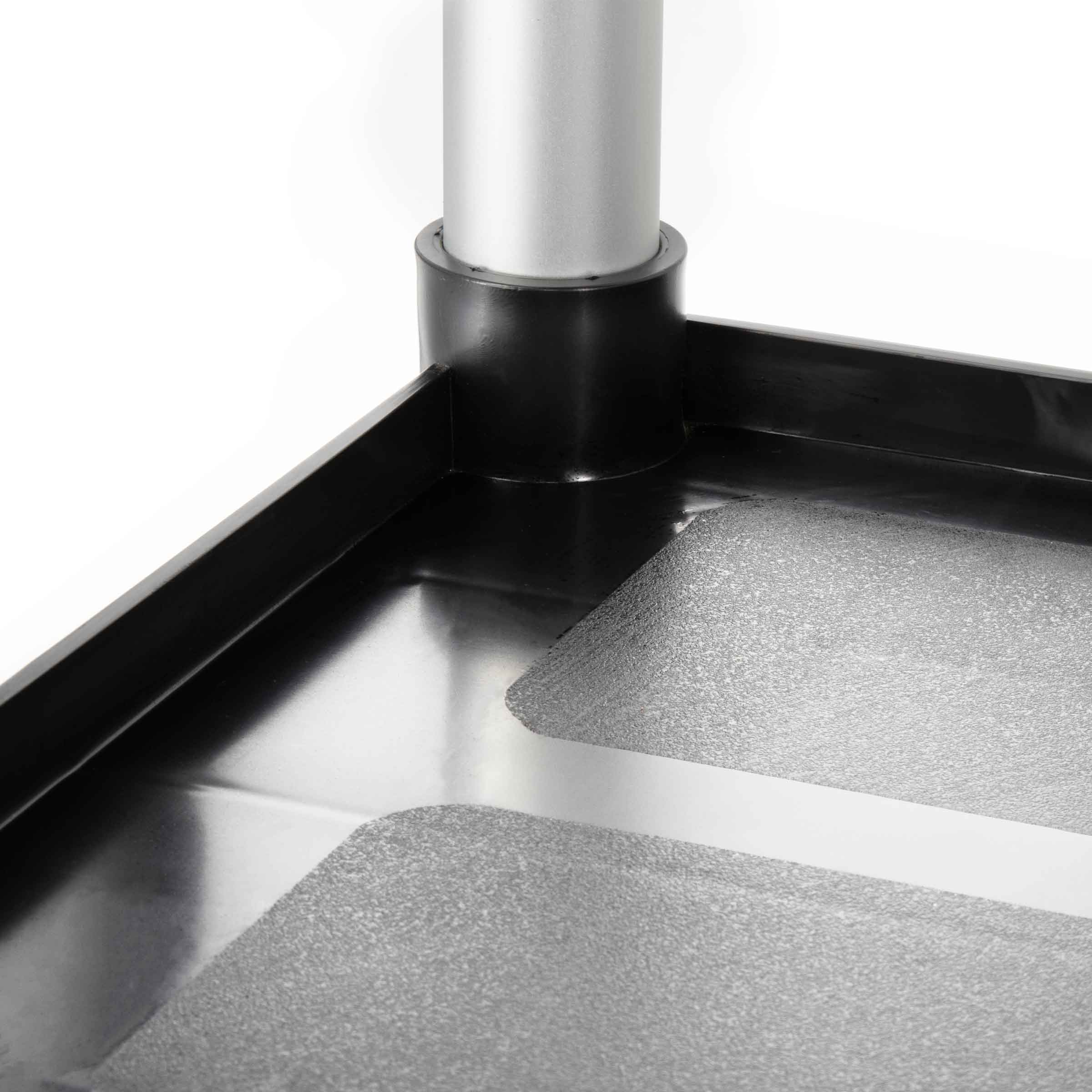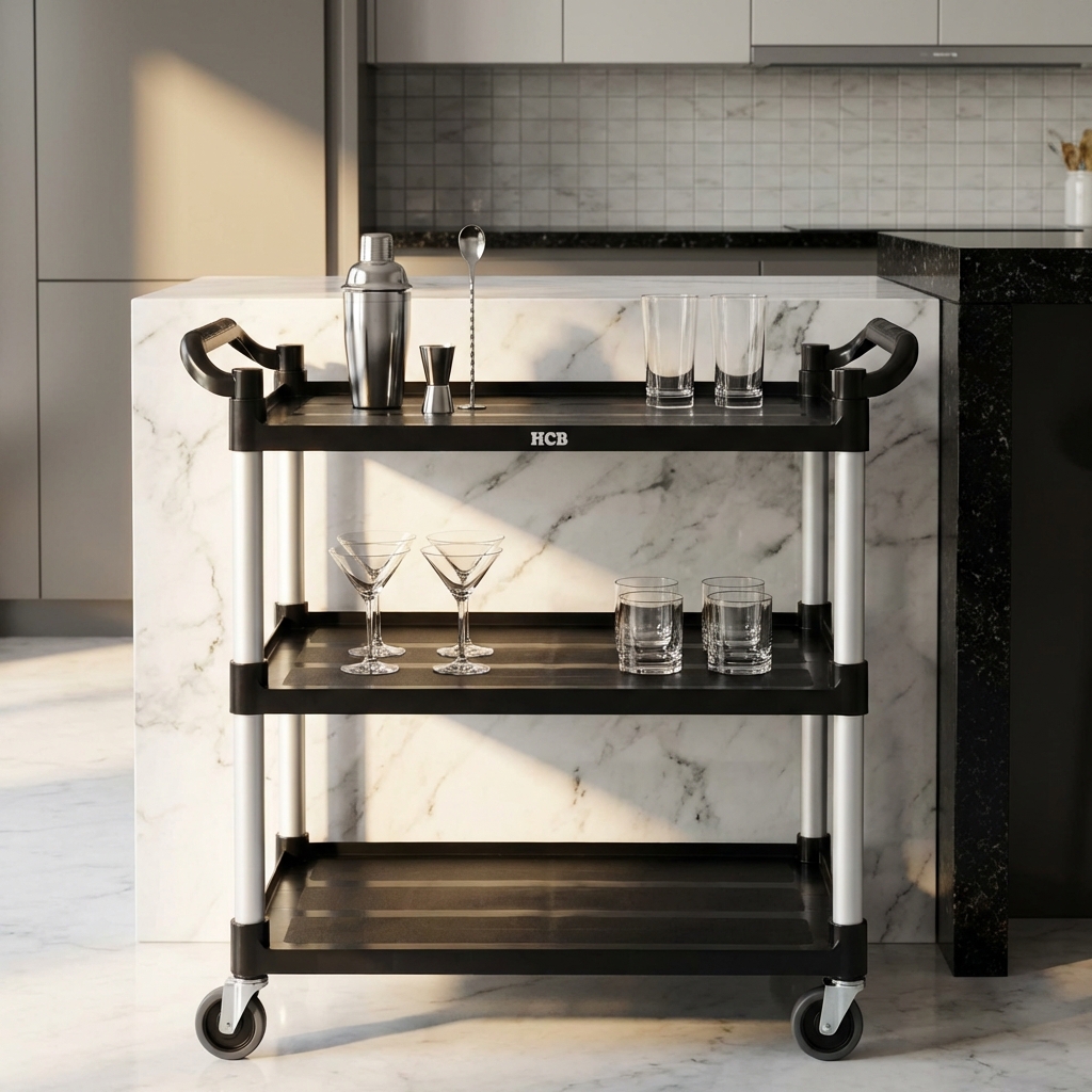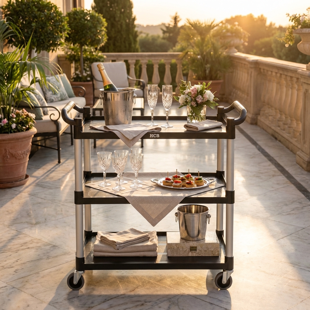 Met meerdere niveaus en ruime plateaus biedt de serveerwagen voldoende opbergruimte voor al uw serveerbehoeften. De plateaus zijn ontworpen met opstaande randen om te voorkomen dat items tijdens het transport verschuiven of vallen. Dit zorgt voor een veilig en stabiel transport van borden, glazen, schalen, dienbladen en andere benodigdheden.