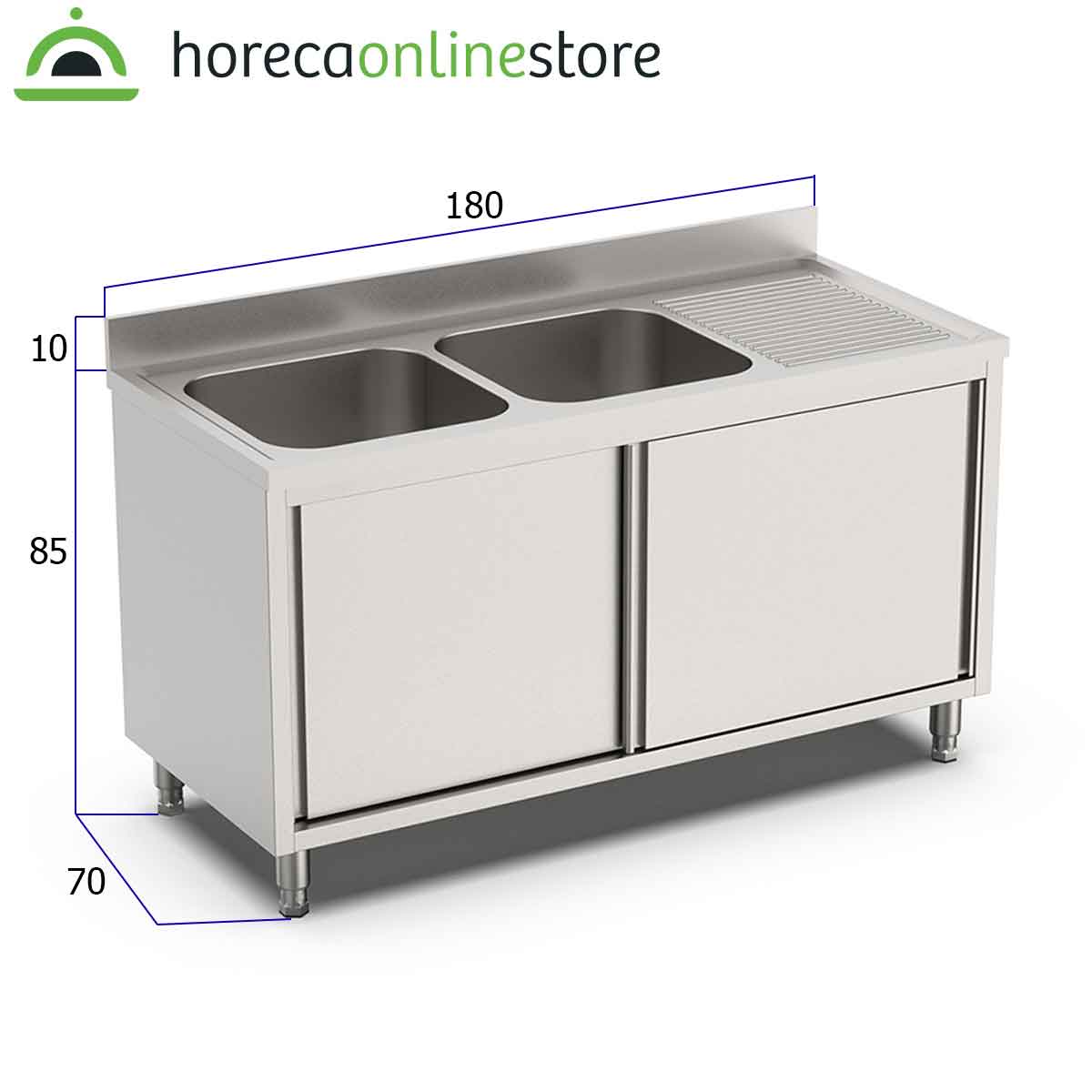 HCB Spoeltafel – dubbele spoelbakken links – schuifdeuren – 180 cm – RVS