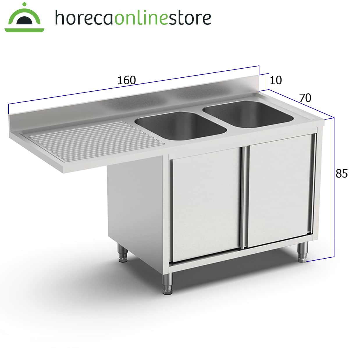 HCB Spoeltafel – dubbele spoelbakken rechts – schuifdeuren – 160 cm – RVS