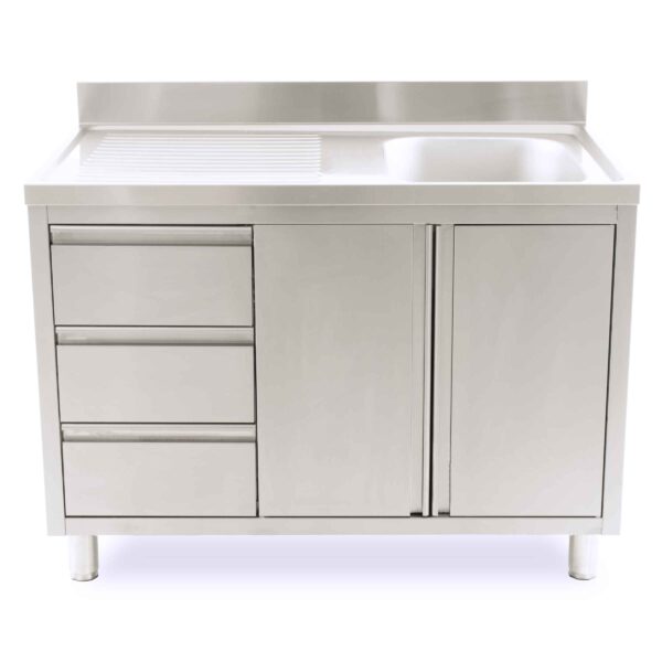 Om veilig, optimaal en efficiënt te kunnen werken in uw professionele keuken zijn RVS spoeltafels van groot belang. voorzien van een sterk RVS blad, stevige poten en strak afgewerkte hoeken is deze spoeltafel van het merk HCB daarom de perfecte keuze! Deze spoeltafel heeft een handige opbergruimte onder de spoelbak afgesloten door klapdeuren en 3 uitschuifbare lades. De tafel is van sterk RVS gemaakt en daardoor zeer geschikt om in de professionele keuken te gebruiken.