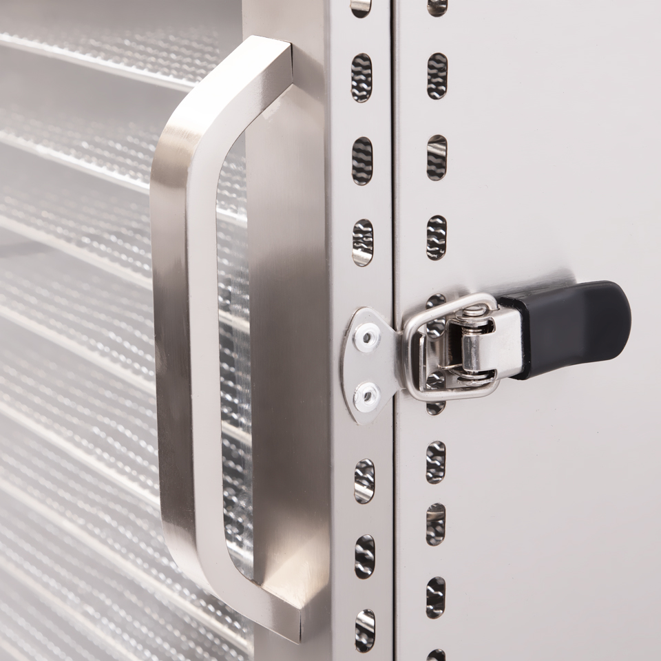 De 12 RVS-droogrekken bieden veel capaciteit op een compact oppervlak. Dankzij de afstand van 30 mm tussen de rekken circuleert de warme lucht optimaal, waardoor producten gelijkmatig drogen. De RVS-behuizing is robuust, hygiënisch en eenvoudig te reinigen – perfect voor intensief professioneel gebruik.