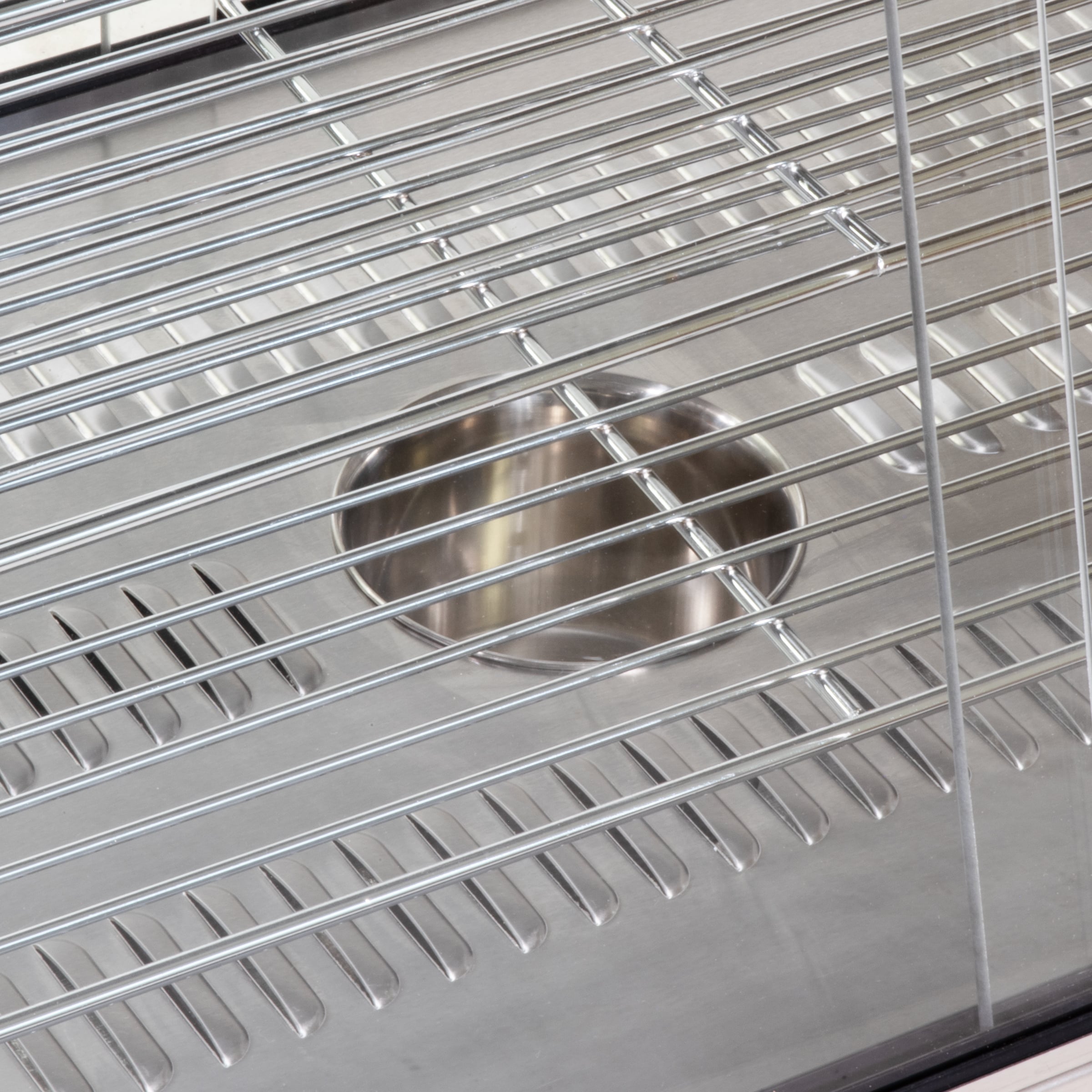 Met zijn ruime capaciteit biedt warmhoudvitrine voldoende ruimte en is te gebruiken voor verschillende gerechten, zoals broodjes, gebak, quiches, warme snacks en nog veel meer. De doorzichtige zijpanelen zorgen voor een uitstekende zichtbaarheid van het voedsel, waardoor klanten verleid worden en het gerecht gemakkelijk kunnen kiezen.