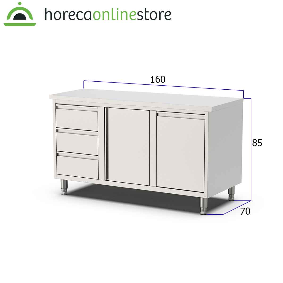 HCB Werkkast – klapdeur – 3 lades – afvalbak – 160 cm – RVS